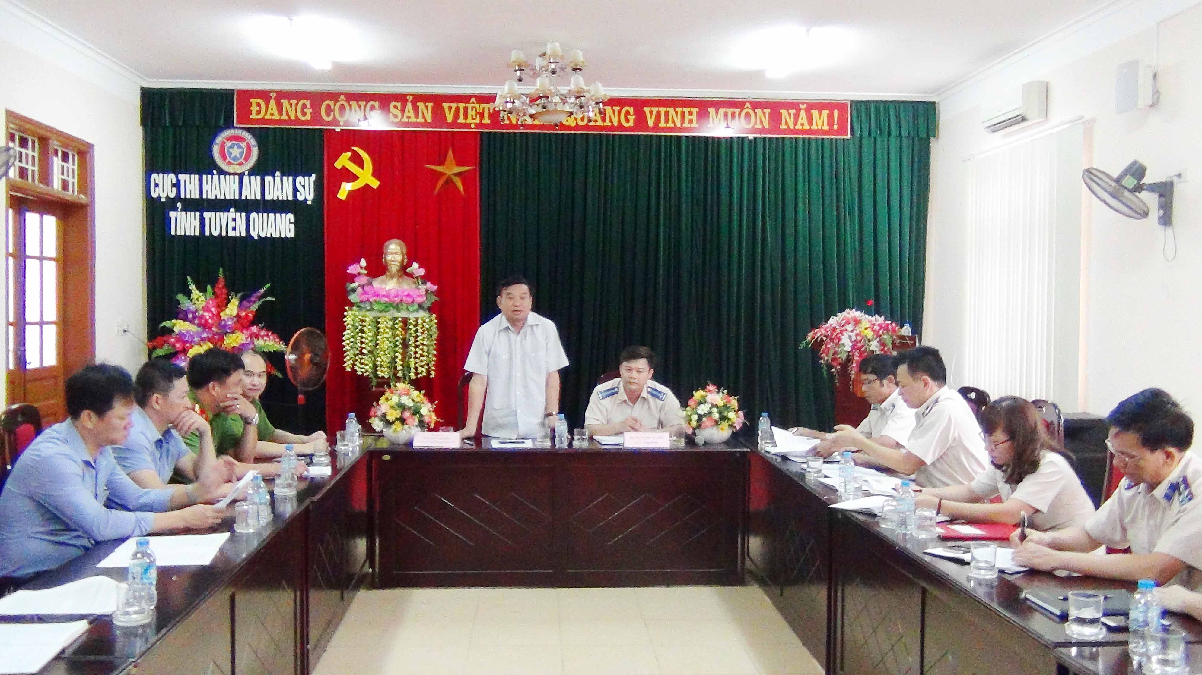 Thực hiện Quy chế phối hợp số 911/QCLN-TCTHADS-TCTHAHS ngày 26/11/2015 giữa Tổng cục Thi hành án dân sự - Bộ Tư pháp và Tổng cục cảnh sát Thi hành án hình sự và Hỗ trợ tư pháp - Bộ Công an và Quy chế số 329/QCPH-CTHADS-TG ngày 22/7/2016 giữa Cục Thi hành án dân sự tỉnh Tuyên Quang và Trại giam Quyết Tiến trong công tác thi hành án dân sự trên địa bàn tỉnh Tuyên Quang, chiều ngày 02/8/2017, Cục Thi hành án dân sự và Trại giam Quyết Tiến đã tổ chức Hội nghị sơ kết một năm thực hiện Quy chế phối hợp trong công tác thi hành án dân sự giữa hai đơn vị. Tham dự Hội nghị, về phía Cục THADS gồm có đồng chí Nguyễn Tuyên, Cục trưởng; đồng chí Nguyễn Văn Quế, Phó Cục trưởng; lãnh đạo các Phòng chuyên môn thuộc Cục; lãnh đạo Chi cục THADS các huyện, thành phố. Về phía Trại giam Quyết Tiến có đồng chí Đại tá Nguyễn Xuân Trường, Giám thị Trại giam; các đ/c Phó Giám thị phụ trách các phân trại K1, K3, K3, K4 và Đội trưởng Đội giáo dục - hồ sơ.