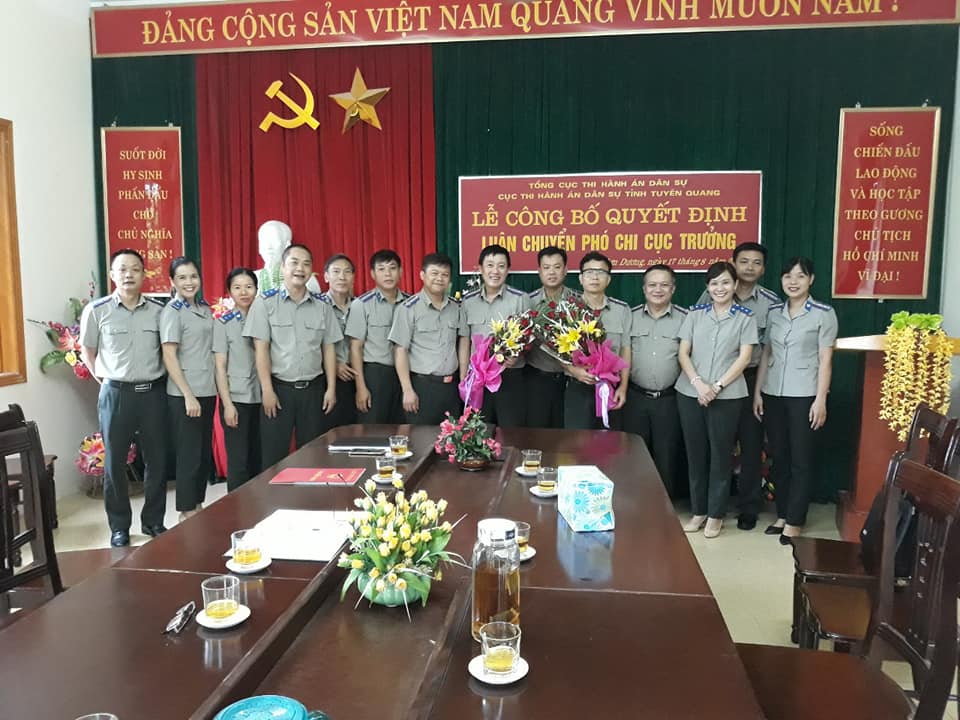 Trong 2 ngày 16 và 17/8/2018, Cục Thi hành án dân sự tỉnh Tuyên Quang đã tổ chức trao Quyết định luân chuyển công chức giữ chức vụ lãnh đạo Chi cục Thi hành án dân sự huyện Sơn Dương, Hàm Yên và Na Hang . Dự buổi lễ trao Quyết định có đồng chí Nguyễn Tuyên - Cục trưởng; đ/c Ứng Anh Tuấn - Trưởng phòng Tổ chức cán bộ, cùng toàn thể lãnh đạo, công chức, người lao động thuộc các Chi cục.