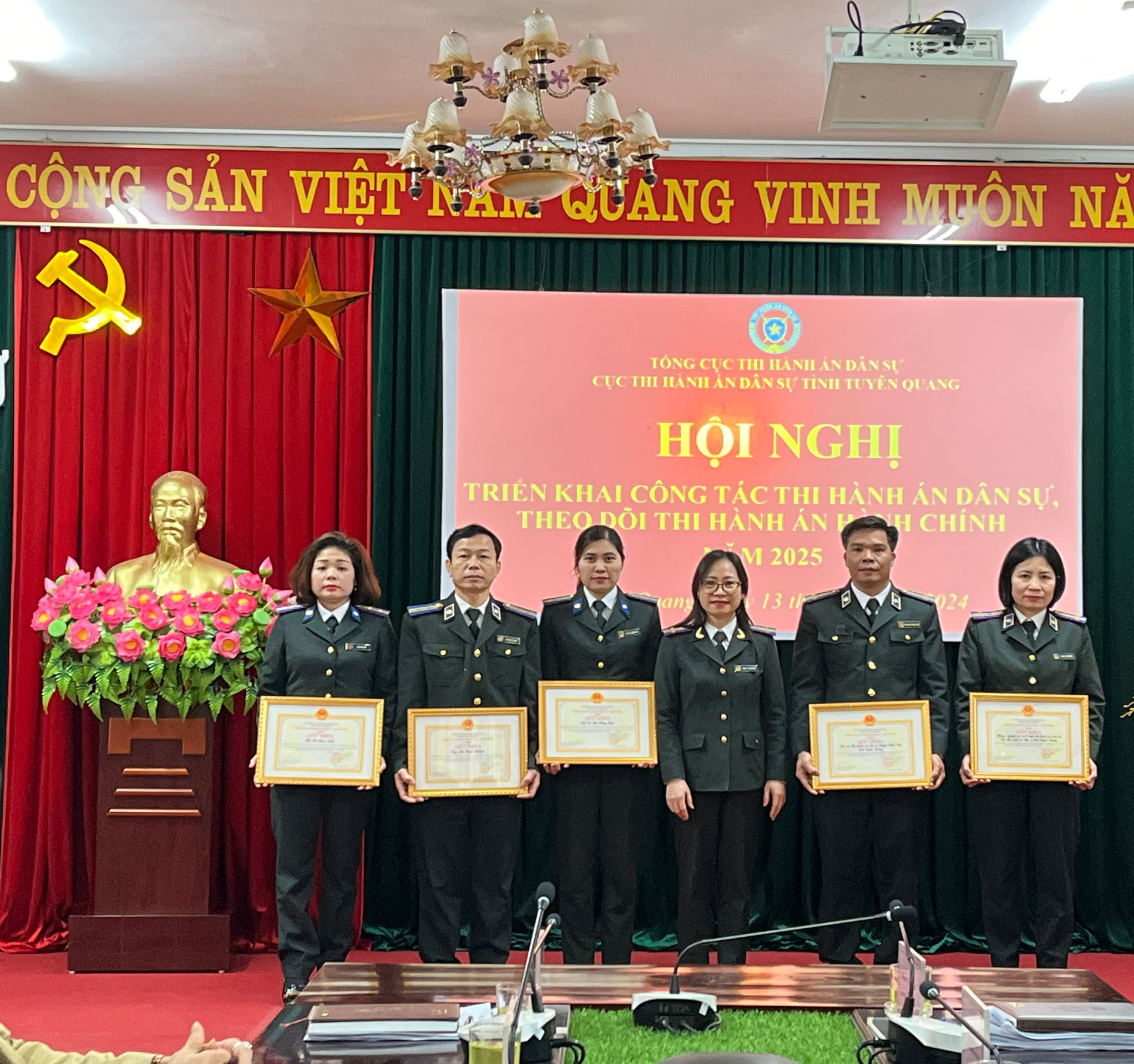 Tại Hội nghị, đã công bố và tặng giấy khen của Tổng Cục trưởng Tổng Cục thi hành án dân sự cho tập thể và cá nhân đã hoàn thành xuất sắc nhiệm vụ về thành tích xuất sắc, tiêu biểu trong phối hợp hoạt động thuộc lĩnh vực thi hành án dân sự Đợt thi đua cao điểm nhân dịp kỷ niệm 78 năm Ngày truyền thống THADS (19/7/1946-19/7/2024), trong đó có 01 tập thể và 02 cá nhân ngoài ngành (Uỷ ban nhân dân xã Tứ Quận, huyện Yên Sơn; ông Đỗ Kiếm Anh - Giám đốc Chi nhánh Văn phòng Đăng ký đất đai huyện Yên Sơn; ông Nguyễn Việt Dũng - Phó Chủ tịch UBND xã Trung Môn, huyện Yên Sơn) và 02 tập thể, 03 cá nhân trong ngành.
