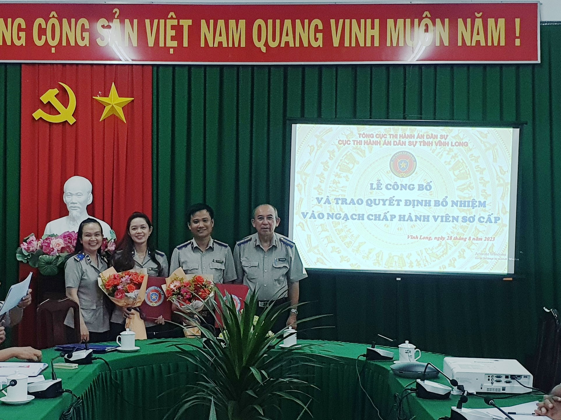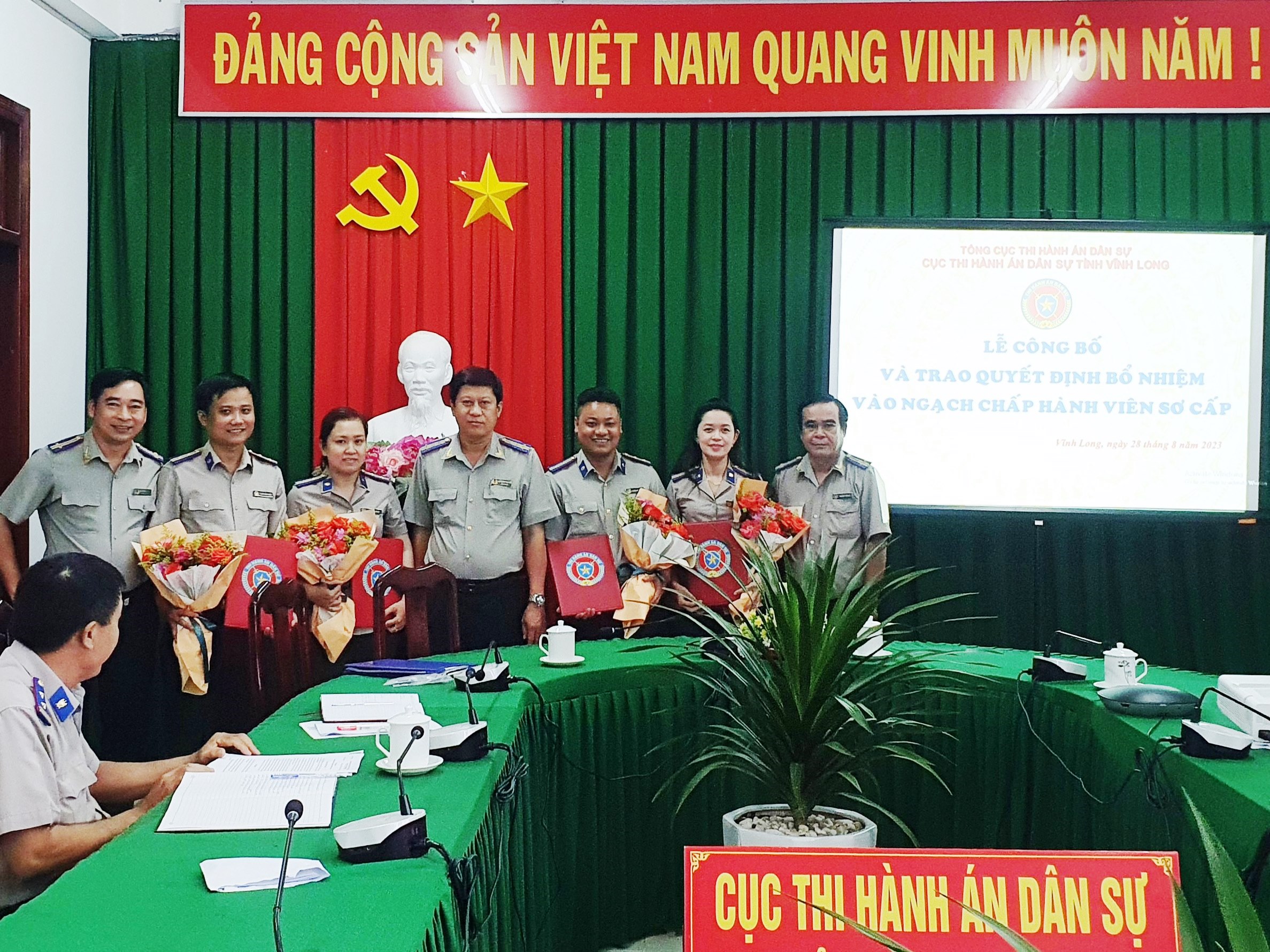Chiều ngày 28/8/2023, Cục Thi hành án dân sự tỉnh Vĩnh Long tổ chức lễ công bố và trao Quyết định bổ nhiệm Chấp hành viên sơ cấp đối với 04 đồng chí trúng tuyển kỳ thi tuyển Chấp hành viên sơ cấp và được Bộ trưởng Bộ Tư pháp quyết định bổ nhiệm vào ngạch Chấp hành viên sơ cấp.