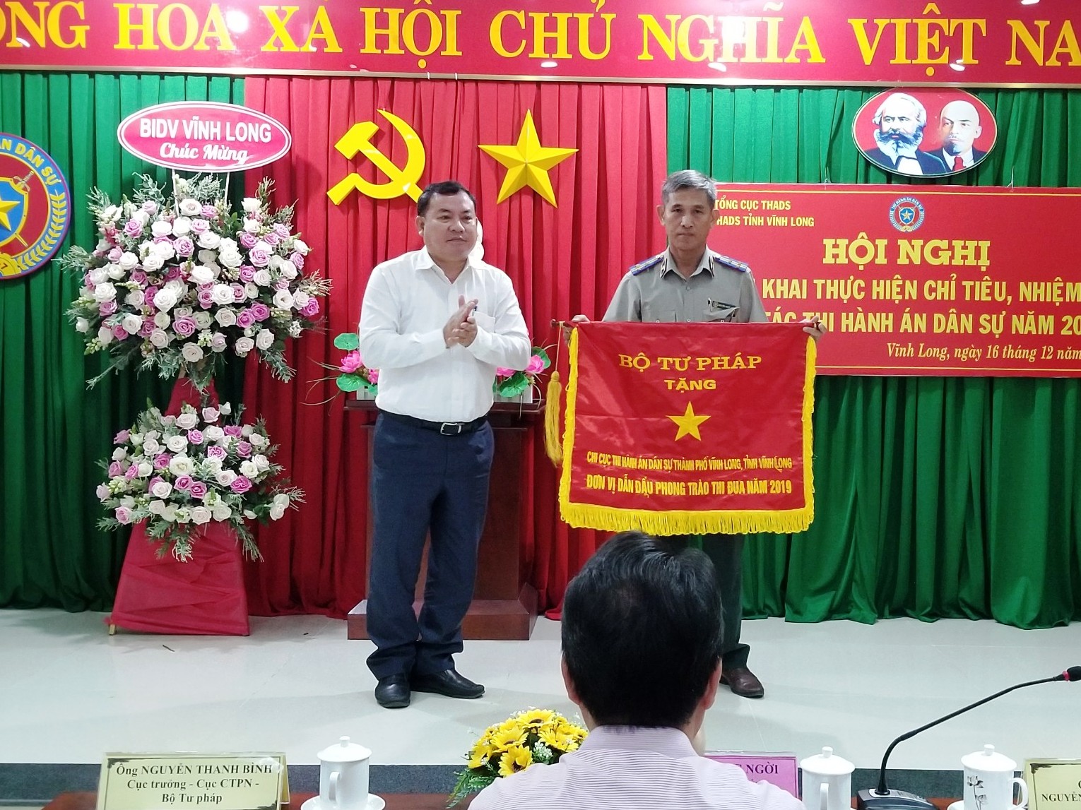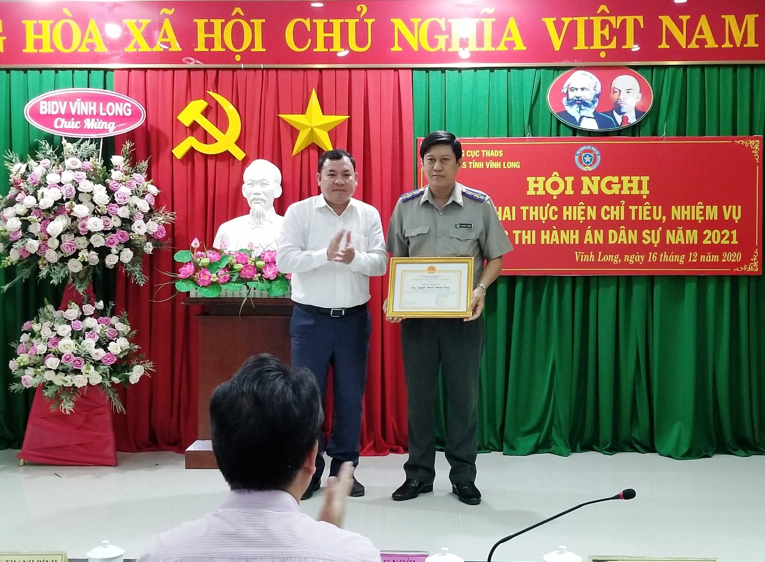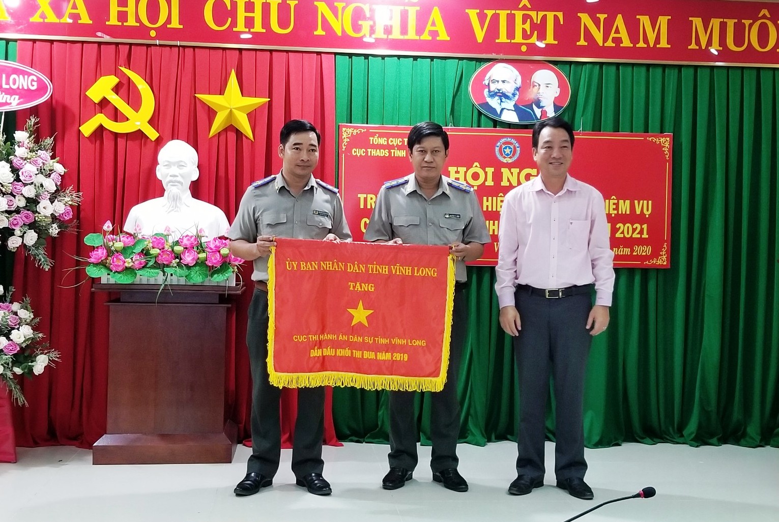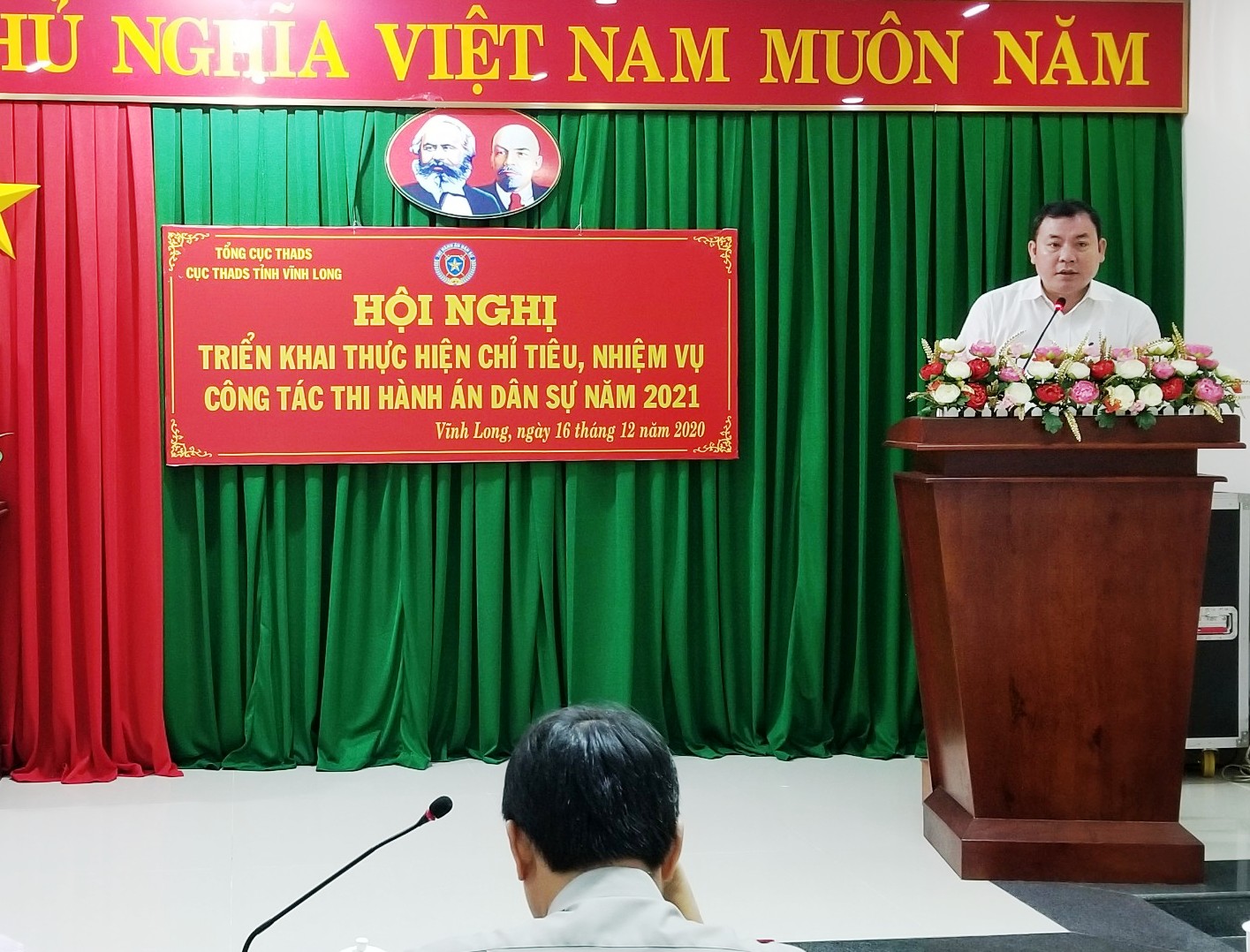Chiều ngày 16/12/2020 Cục THADS tỉnh Vĩnh Long đã tổ chức Hội nghị triển khai thực hiện chỉ tiêu, nhiệm vụ công tác THADS năm 2021 với sự chủ trì, chỉ đạo Hội nghị có ông Lữ Quang Ngời - Phó Bí thư Tỉnh ủy - Chủ tịch UBND tỉnh - Trưởng Ban Chỉ đạo THADS tỉnh; ông Nguyễn Thanh Bình - Cục trưởng, Cục Công tác Phía Nam - Bộ Tư pháp; ông Nguyễn Thành Thanh Dũng - Cục trưởng, Cục THADS tỉnh. Tham dự Hội nghị còn có ông Nguyễn Hoàng Danh - Phó cục trưởng, Cục THADS tỉnh; đại diện Thường trực HĐND tỉnh; đại diện lãnh đạo các ban ngành tỉnh: Viện Kiểm sát nhân dân, Tòa án nhân dân, Công an, Sở Tư pháp, Sở Tài nguyên & Môi trường; Sở Tài chính; Ngân hàng Nhà nước - Chi nhánh tỉnh Vĩnh Long,… cùng các đồng chí lãnh đạo các phòng chuyên môn thuộc Cục, lãnh đạo các Chi cục trực thuộc và Chấp hành viên thuộc Cục.